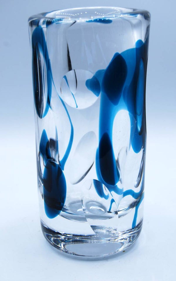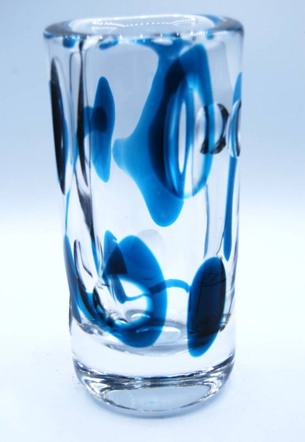 BEAUTIFUL AND VERY RARE THICKWALLED LARGE AND HEAVY VASE IN CLEAR GLASS WITH PETROL BLUE AND CUTTINGS MADE BY KOSTA AND DESIGNED BY VICKE LINSTRAND. SIGNED KOSTA 46693 LINDSTRAND. HEIGHT 19 CM. IN A VERY GOOD VINTAGE CONDITION.