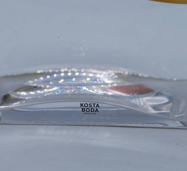 BEAUTIFUL AND RARE DECANTER WITH METAL STOPPER "MACHO" IN RED AND YELLOW MADE BY KOSTA BODA AND DESIGNED BY KJELL ENGMAN. 21 CM. SIGNED: KOSTA BODA, K. ENGMAN, 9060011. IN VERY GOOD CONDITION.